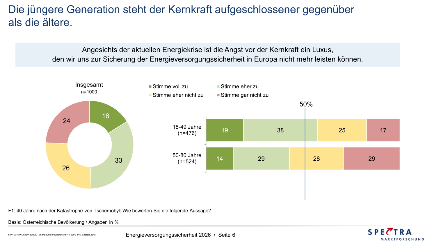 Überraschend deutlich zeigt sich ein Generationenwandel in der Bewertung der Kernkraft. Knapp die Hälfte der Österreicher (49%) ist der Meinung, man könne sich die „Angst vor der Atomkraft“ schlicht nicht mehr leisten. In der jüngeren Generation (die Tschernobyl nicht bewusst miterlebt hat) steigt dieser Wert sogar auf 57%.