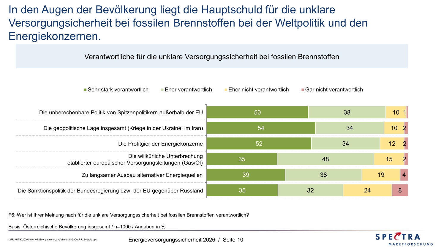 Die Verantwortung für die aktuelle Krise verorten die Österreicher primär bei der Weltpolitik und den Energiekonzernen. Sanktionspolitik oder der schleppende Ausbau der Erneuerbaren werden erst nachgelagert als Ursachen gesehen.