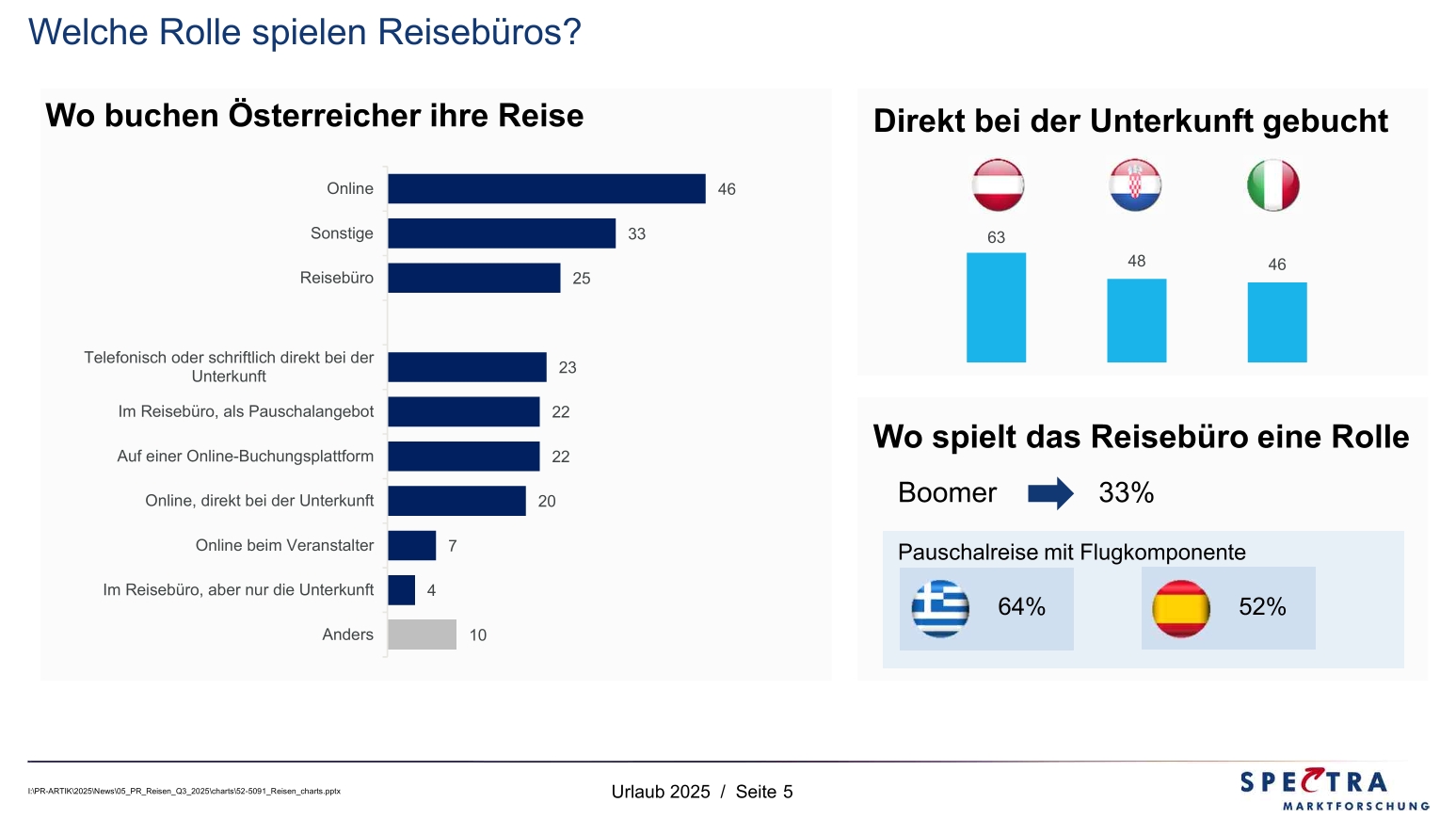 Fast die Hälfte der Österreicher:innen bucht online, entweder auf den großen Buchungsplattformen (22%), direkt beim Veranstalter (7%) oder auch direkt bei der Unterkunft (20%). Unter den Boomern nimmt der Anteil der Online Buchungen ab und ein Drittel bucht hier im Reisebüro. Boomer haben ein etwas komplexeres Reiseverhalten, Reisen gehen in ausgefallenere und fernere Länder, und umfassen neben der Unterkunft auch Flüge und andere Komponenten. Bei Pauschalreisen nach Spanien oder Griechenland mit einer Flugkomponente wird ebenfalls wesentlich häufiger das Reisebüro aufgesucht.