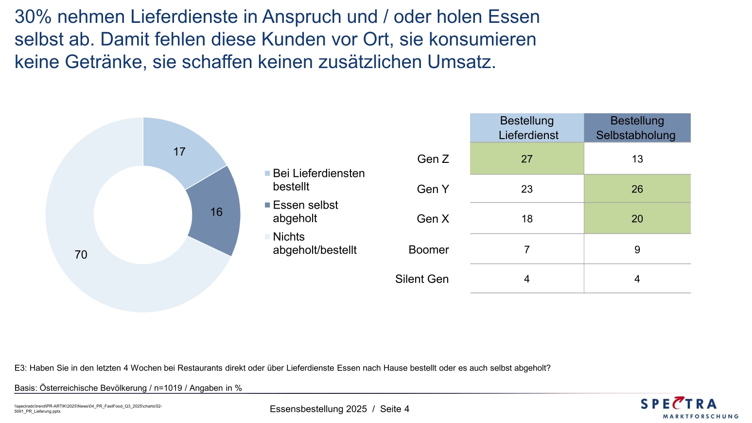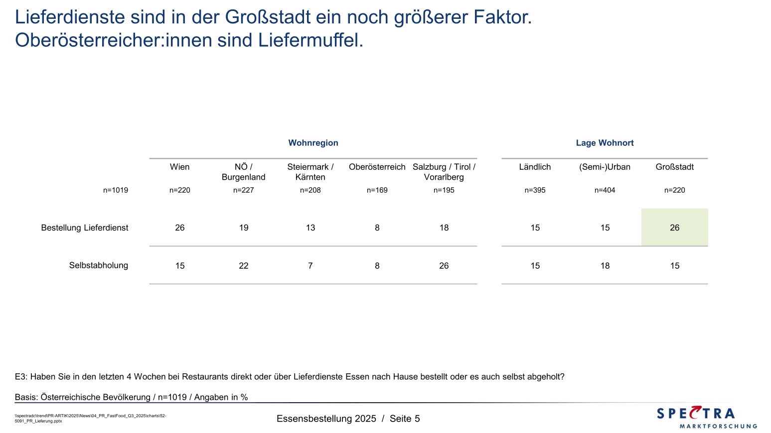 Nutzer:innen von Lieferdiensten für Essen sind eher jünger und leben im großstädtischen oder zumindest semi-urbanen Raum der Landeshauptstädte bzw. der Stadtgemeinden. Selbstabholung wiederum spielt in den westlichen Bundesländern und im Flächenbundesland Niederösterreich eine größere Rolle als im restlichen Bundesgebiet. Der typische Selbstabholer ist zwischen 30 und 50 Jahre alt, ist mobil und nimmt eine Abholfahrt in Kauf oder packt am Weg die Essensbestellung für zuhause ein.