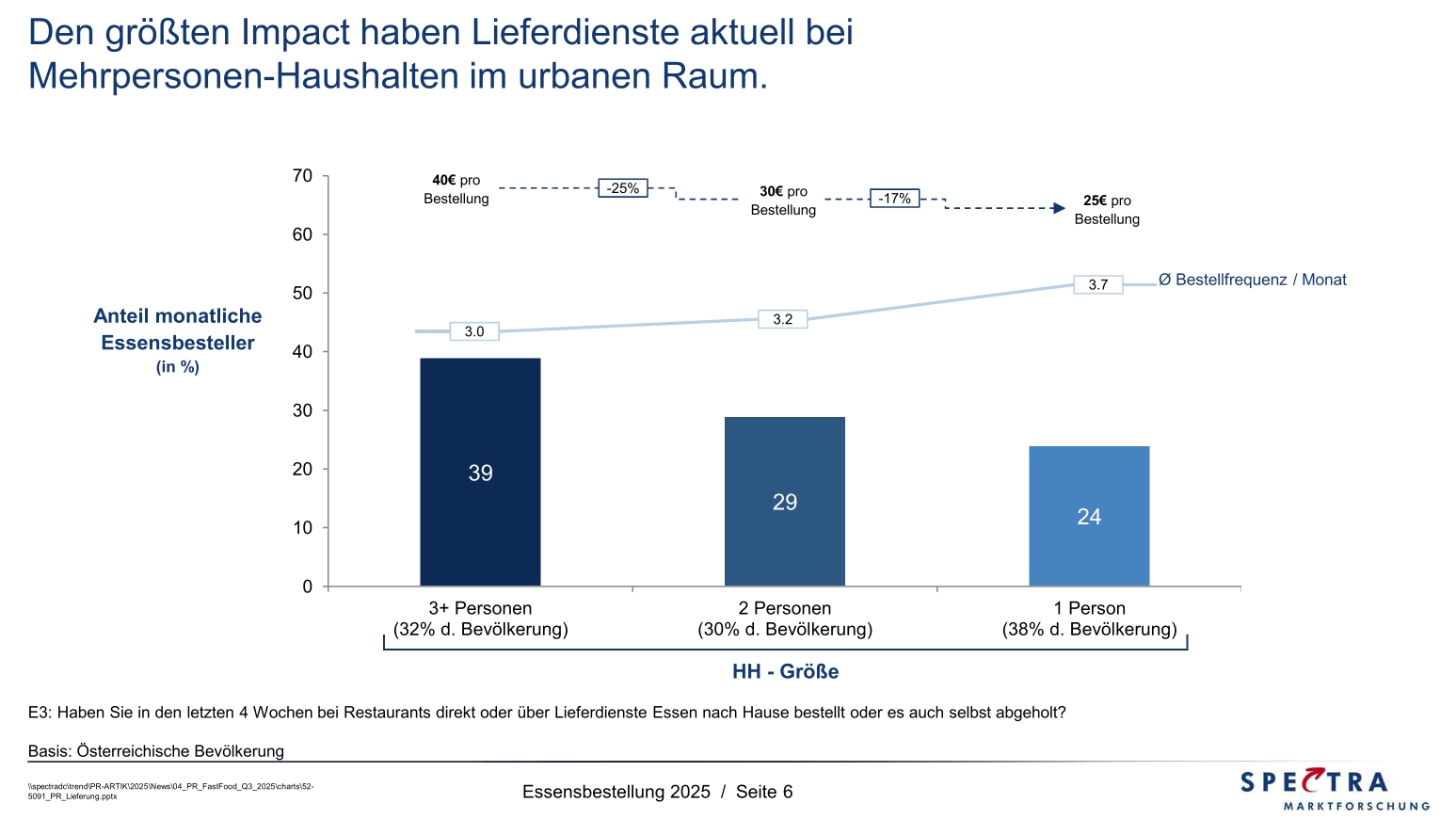 Bei den Essensbestellern liegt die Frequenz im Schnitt bei 3 bis 4 Bestellungen pro Monat. Eine Zielgruppe sticht allerdings hervor: Haushalte mit 3 Personen und mehr sind zurzeit am spannendsten. Diese Gruppe macht größenmäßig ein Drittel der Gesamtbevölkerung aus. Viele aus dieser Gruppe nutzen Lieferdienste (24%) oder holen selbst ab (21%). Damit fällt der Anteil der Essensbesteller (40%) in dieser Zielgruppe deutlich höher aus als in der Gesamtbevölkerung. Die Bestellfrequenz in dieser Zielgruppe ist zwar nicht auffällig (im Schnitt 3 Mal pro Monat), aber der Umsatz ist höher (im Schnitt 40 Euro pro Bestellung).