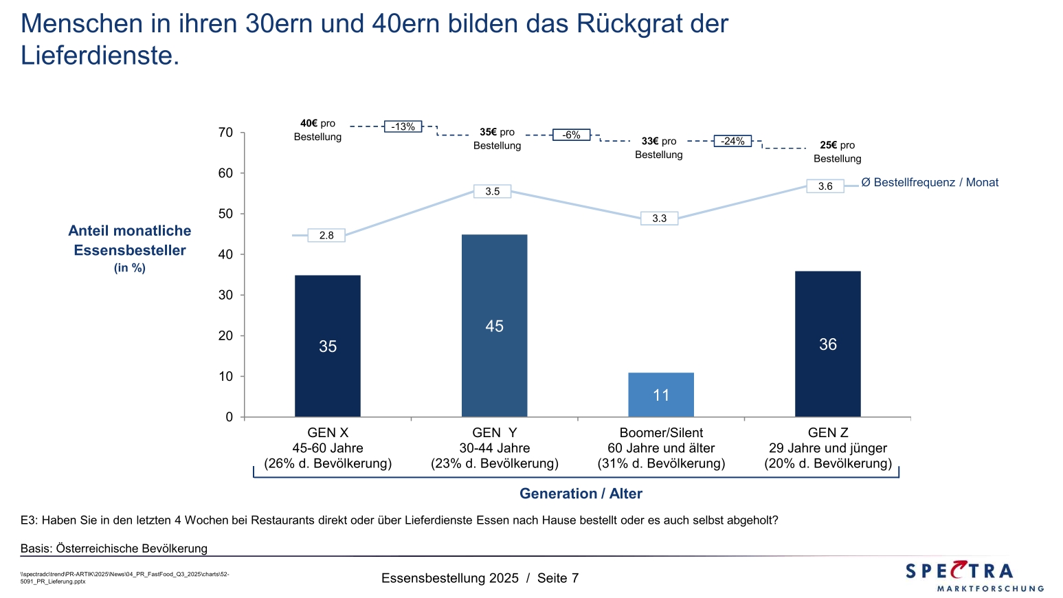 Aus der Perspektive der Lieferdienste gibt es eine Herausforderung: Einerseits benötigen sie die Infrastruktur der Gastronomie um ein Produkt anbieten zu können, andererseits nehmen sie genau dieser Gastronomie Kund:innen weg. Und würden die Lieferdienste attraktiver für ältere Menschen, dann würde es für die Gastronomie noch schwieriger. Ein Teil der Generation X (45 bis 60 Jahre), aber noch viel mehr die Boomer und die Silent Generation (also über 60-Jährige), zeigen den Lieferdiensten und der Essensbestellung noch die kalte Schulter. Die wenigen älteren User von Lieferungen / Bestellungen haben aber ein interessantes Nutzungsverhalten: Wenn der Schritt zur Bestellung einmal gemacht ist, dann bestellen ältere Menschen genauso häufig und geben im Schnitt pro Bestellung mehr als 30 Euro aus. Also müssen sich Lieferdienste fragen, ob technische Barrieren (Lesbarkeit, Bezahlmöglichkeiten, Bestellvorgang…) und Gewohnheiten einer breiteren Nutzung im höheren Alter entgegenwirken. Ein niederschwelliger Zugang, ein einfaches Handling und ein entsprechendes Speiseangebot könnten Lieferdienste zur zusätzlichen Versorgungsoption für Ältere machen.